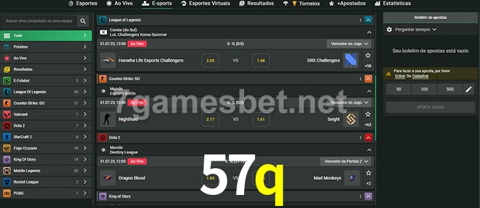O 57q oferece uma grande seleção de opções de apostas em e-sports com probabilidades competitivas